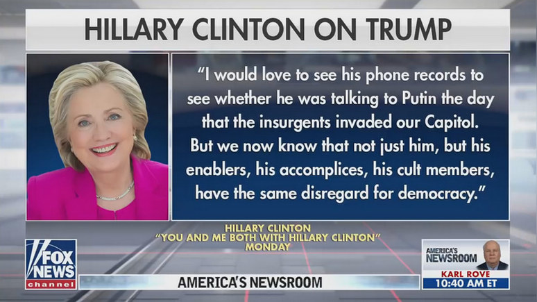 ДЭВИД СПАНТ, корреспондент Fox News: Это серьёзная история. Бывший госсекретарь США намекает на то, что в конгрессе по этому вопросу, возможно, будет проведено расследование в стиле комиссии 9/11. Об этом она упомянула в своём подкасте You and Me Both. Недавно у неё в гостях была спикер палаты представителей Нэнси Пелоси. И они, естественно, обсуждали самую важную новость из Вашингтона — мятеж на Капитолийском холме, произошедший 6 января. Как вы слышали, госсекретарь Клинтон заявила, что хотела бы увидеть записи телефонных звонков президента в тот день.